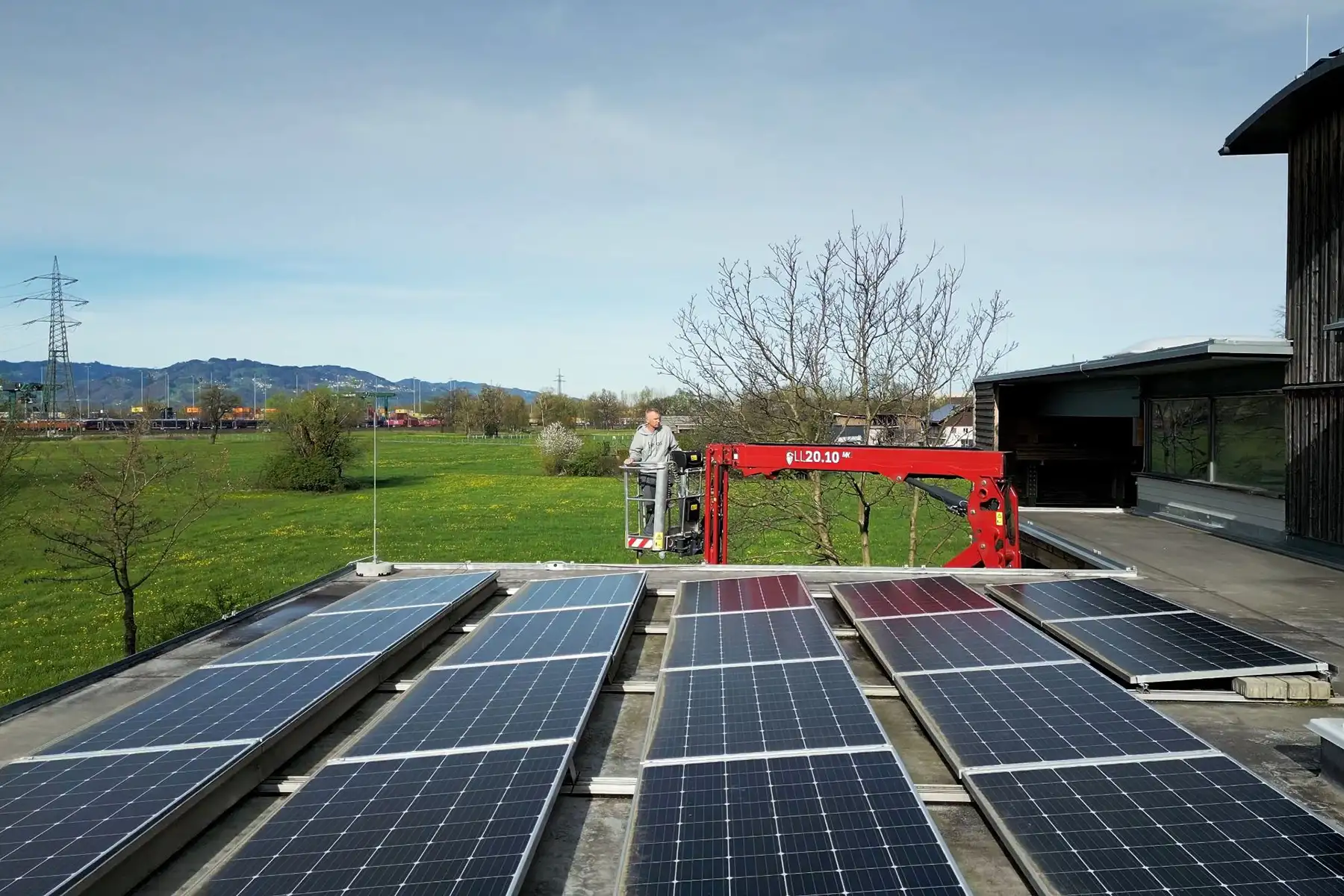 Mithilfe eines Steigers heben wir den Reinigungsroboter „HyCleaner“ sowie alle weiteren erforderlichen Materialien sicher auf das Dach. Diese präzise Logistik stellt sicher, dass alle Komponenten unbeschädigt und bereit für den Einsatz sind.