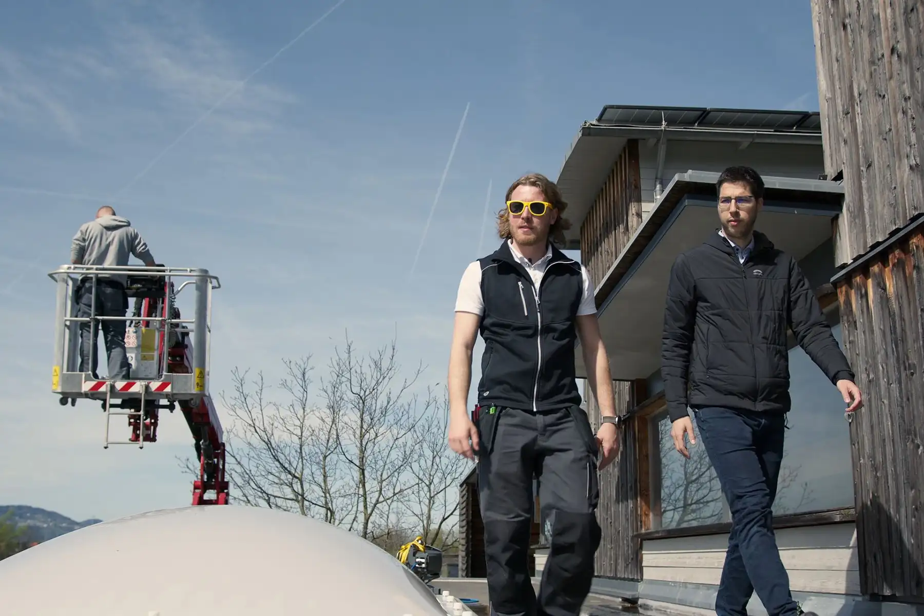 Ankunft und Ermittlung des besten Zugangs zum Dach und der benötigten Wasser- und Stromanschlüsse