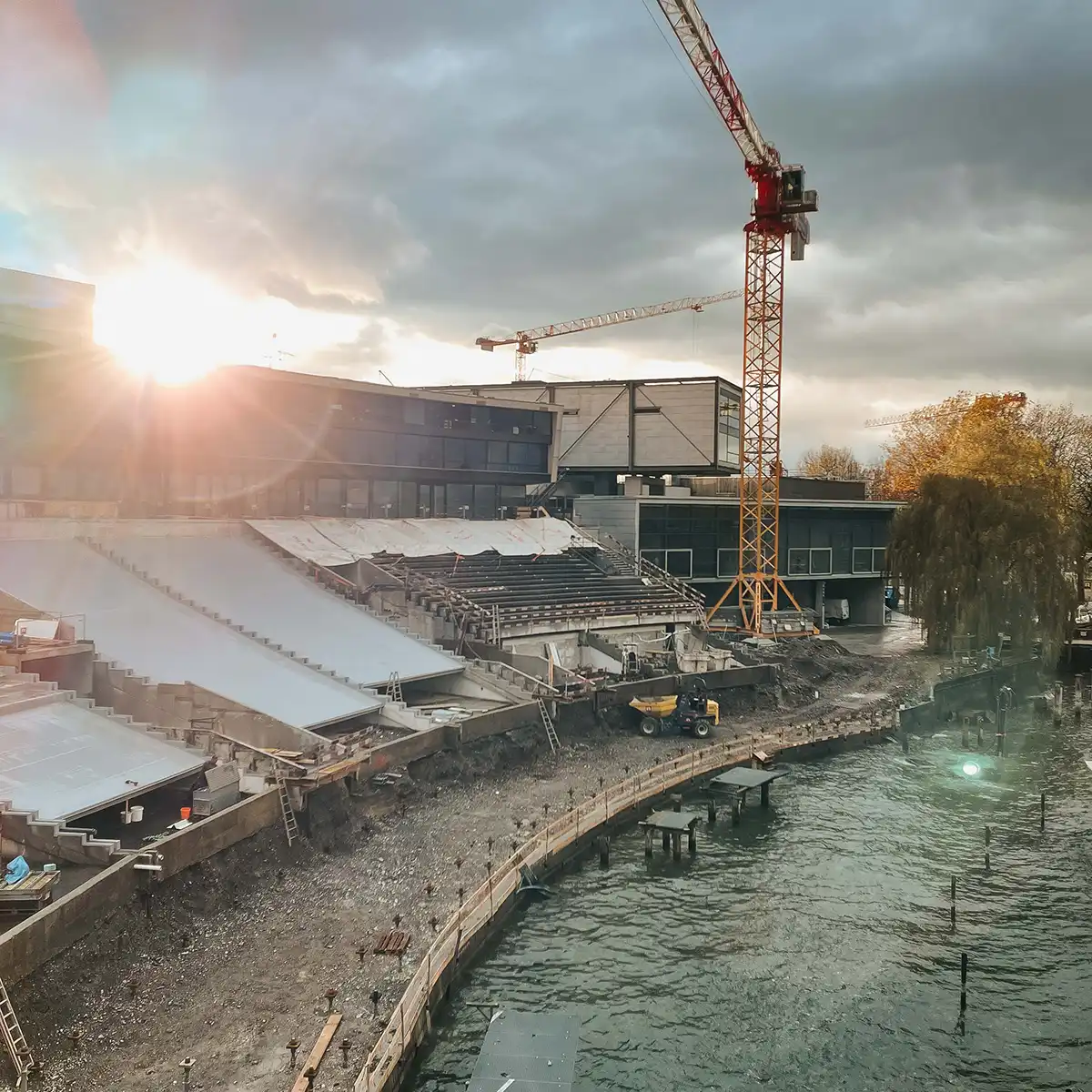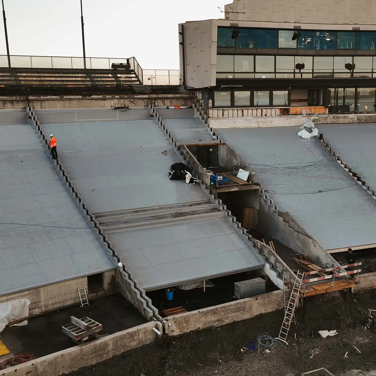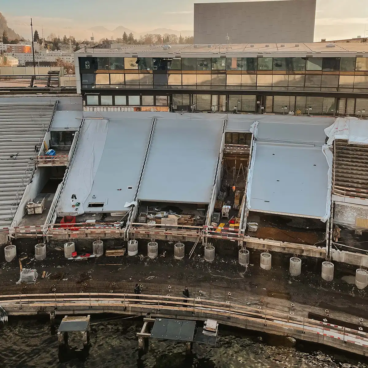 Für die Seebühne in Bregenz durften wir eine einzigartige Speziallösung entwickeln und umsetzen. Die Herausforderung bestand darin, eine tragende Unterkonstruktion aus Trapezsandwichpaneelen zu schaffen und darauf eine Abdichtung mit Sarnafil TPO Folie zu erstellen.