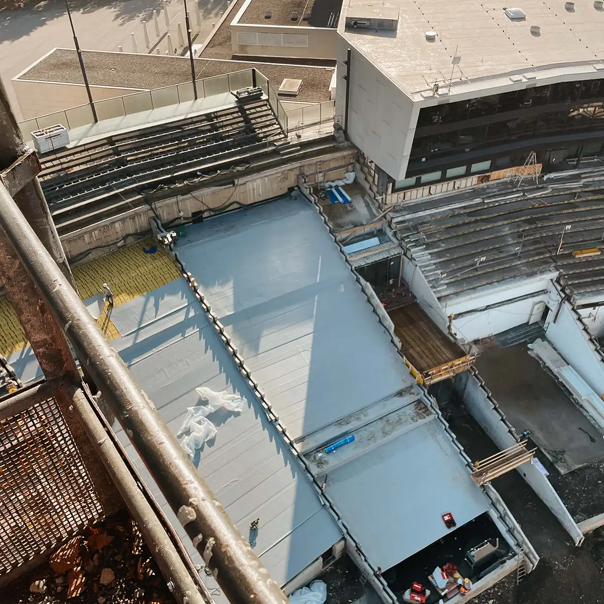 Ein besonderes Merkmal dieses Projekts war die Verkleidung der bestehenden Hauptträger der Tribüne mit einem speziellen Folienblech, das gleichzeitig als Regenrinne fungiert. Für diese Aufgabe wurden mehrere Tonnen Folienblech benötigt, um die Funktionalität und Ästhetik der Tribüne zu gewährleisten.